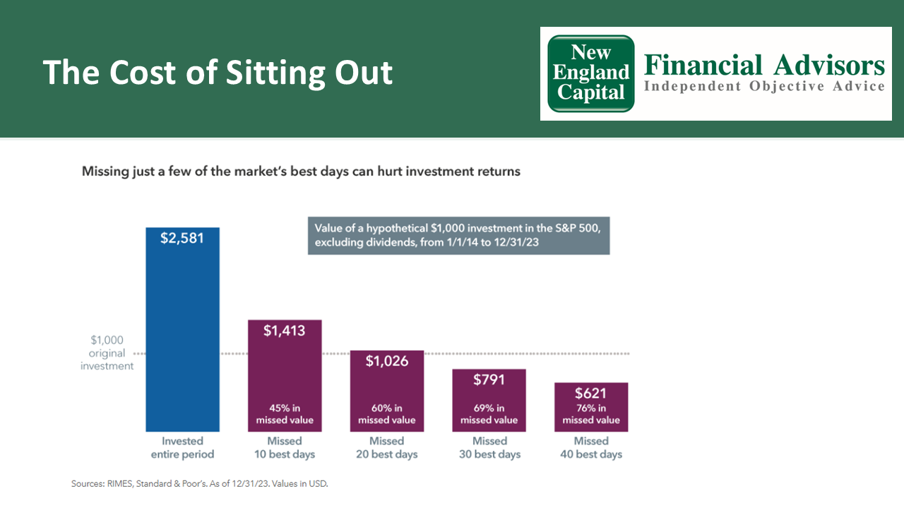 Even missing out on a small number of up days can take a big toll on your returns. A hypothetical investment of $1,000 in the S&P 500 made in 2014 would have grown to $2,581 by the end of 2023. But if that investor missed just the 10 best trading days during that period, he or she would have ended up with just $1,413, or 45% less than if they had just stayed invested. And you can see on the chart, the more of those recovery days you miss, the worse it gets.