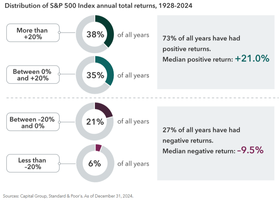 A look back at S&P 500 Index returns since 1928 shows the market was positive 73% of the time, or an average of three years out of four. Stocks sustained negative annual total returns in only 27% of all years.