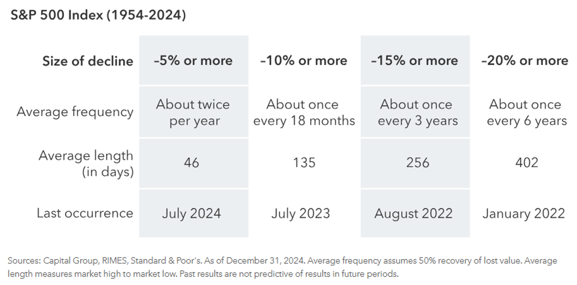 But a look at history shows that market downturns have been somewhat regular events. Corrections — declines of 10% or more — have occurred about once every 18 months and declines of 5% or more have occurred about twice a year. Periods of market volatility are inevitable, but not permanent. When markets are soaring, they can be sensitive to even modestly disappointing news.