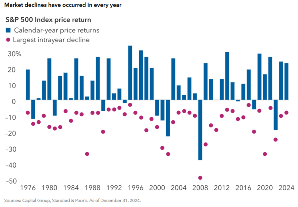 While the longer term impact of the tariffs and DeepSeek’s breakthrough remain unclear, they serve as stark reminders that market surprises are not surprising. What’s more, stocks with elevated valuations can be sensitive to even mildly negative news. While declines are often jarring, it’s worth remembering that market volatility has been relatively tame. Against a backdrop of record-setting highs, the S&P 500’s largest intrayear decline in 2024 was about 8%, and the market rebounded within days.