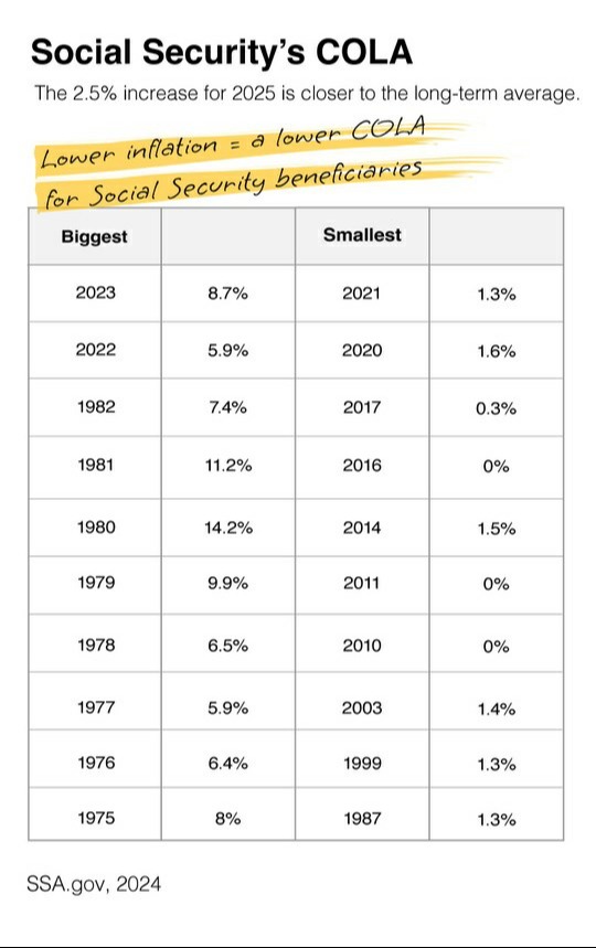 When we created your retirement strategy, we made certain assumptions about income and expenses. If you think this year’s COLA will make your budget a bit more challenging, please let me know as soon as possible. Sometimes, a slight adjustment can be all it takes to make you feel more comfortable as we head into 2025.