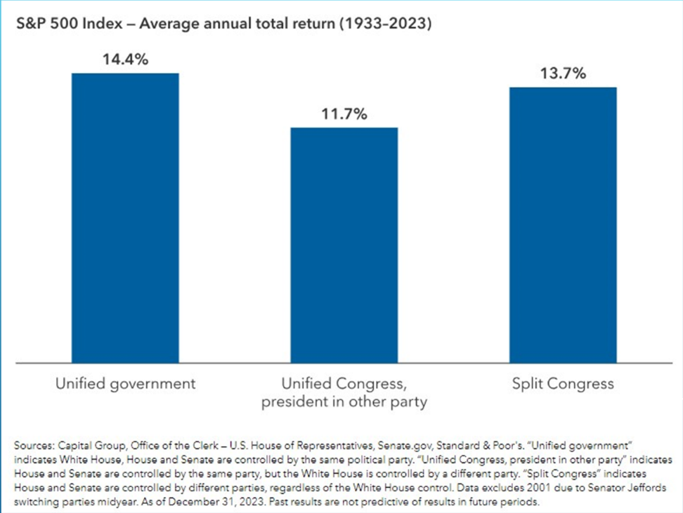 History shows that stocks have done well regardless of the political makeup of Washington. Since 1933, there have been 44 years when one party has controlled both the White House and Congress at the same time. During these periods, stocks averaged a robust 14.4% return, slightly higher than the average gains when Congress was split between the two parties. Historically the “least good” outcome has been when Congress is controlled by the party opposite the president, but even this scenario averaged double-digit returns.