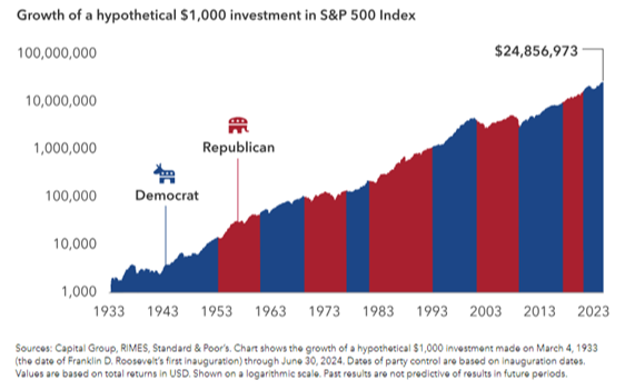 Which party is in power hasn’t made a meaningful difference to stocks either. Since 1933, there have been eight Democratic and seven Republican presidents, and the general direction of the market has always been up. What should matter more to investors than election results is staying invested.